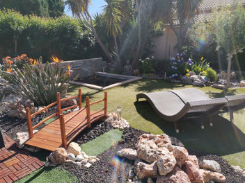 Magnifique jardin avec terrasse, cuisine équipée, salon, 1 suite parentale avec grand lit et salle d'eau, 2e chambre avec grand lit, un atelier pour la création. Possibilité de stationner devant la maison facilement.